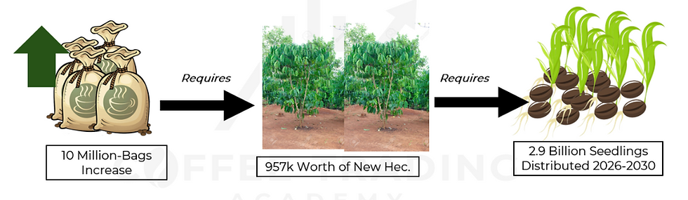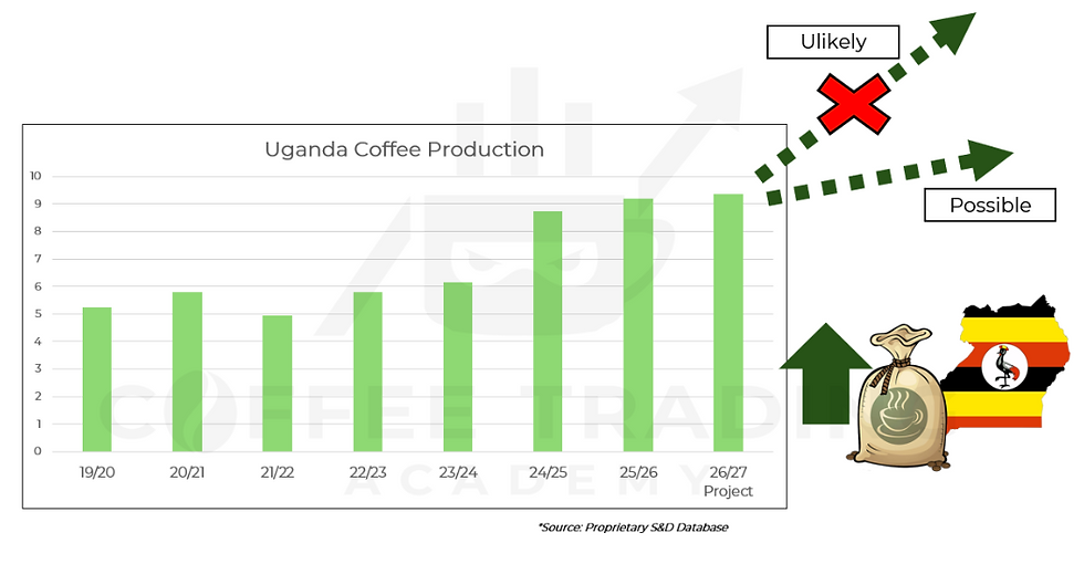 Realistically, Uganda can likely sustain production in the 9–10m bag range over the next few years, or in a favorable scenario — with improved planting intensity, supportive weather, and strong execution — approach 15m bags. Reaching 20m bags by 2030, however, would require a scale and consistency of planting, yields, and execution that has not yet been demonstrated.