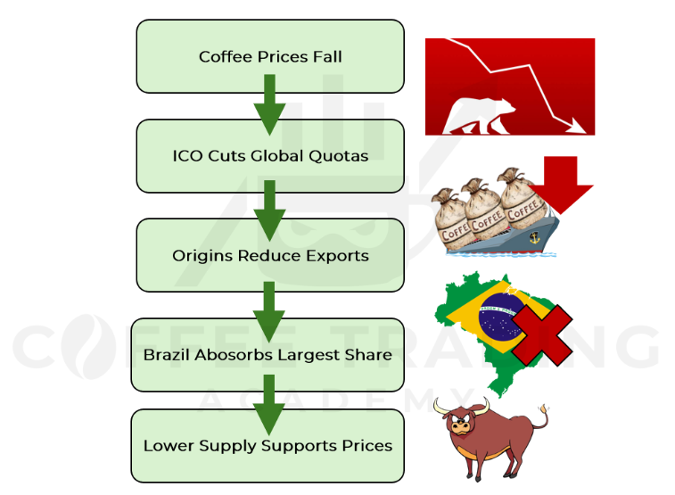 When quotas ended, there was no longer a mechanism to limit exports from origin, and so supply that was stockpiled in origin rapidly flooded the market, leading to the infamous 1989 coffee price crash.